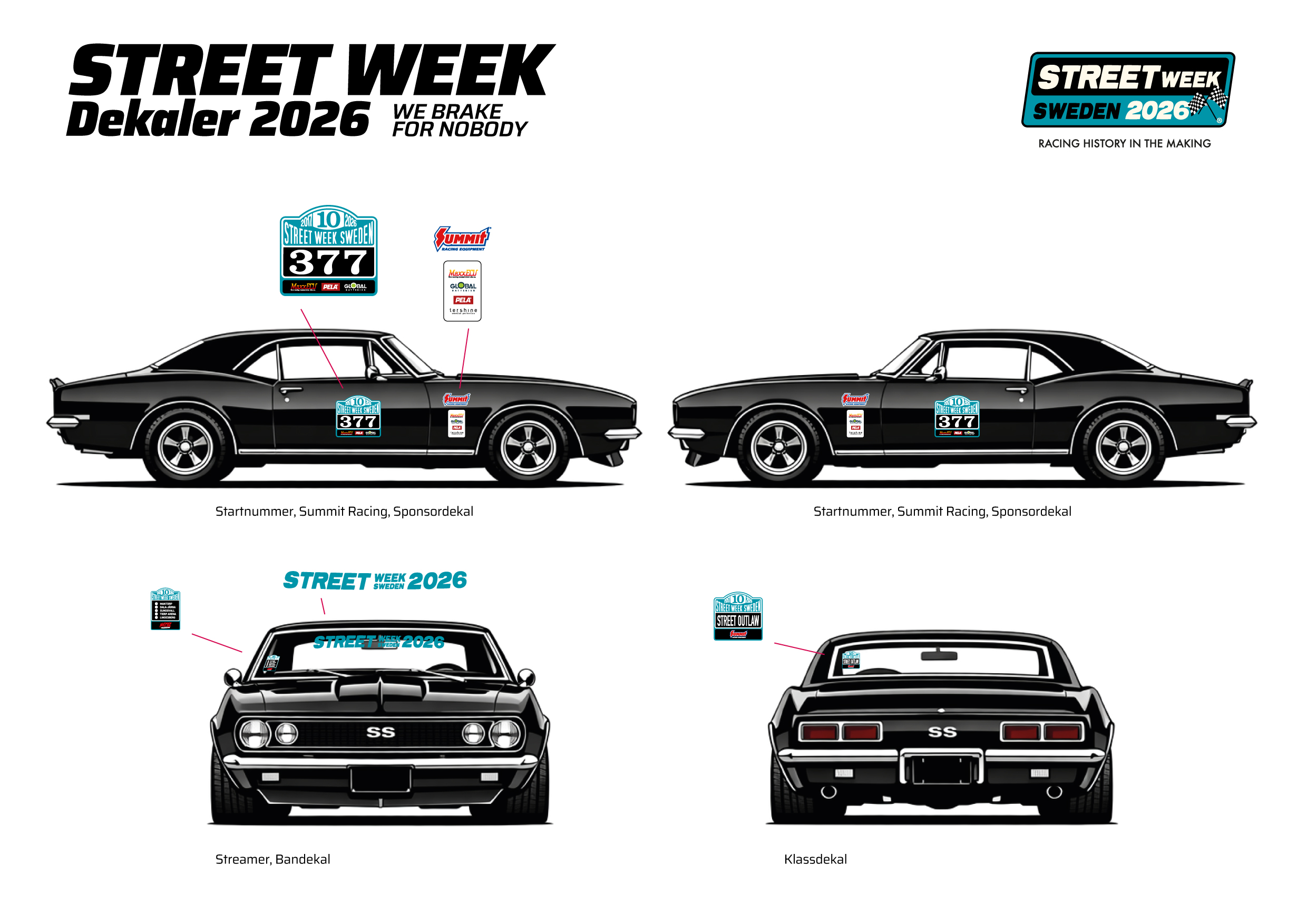 Då dekalerna är obligatoriska så kommer vi även i år att ha ett par olika storlekar på framrutestreamern för att passa på bilar med mindre framrutor. Det är viktigt att ni följer placeringarna så gott det går, det underlättar för ex speakern då han försöker se ert startnummer. Ex sponsordekaler för framskärmar ska inte sättas på baklucka, det resulterar i en varning.